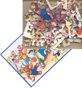 Vi har en stor sortering av gamla träpussel i obrutna förpackningar. Pusslen kommer från den nerlagda pusselfabriken KA. Andersson Bromsten/Spånga. Örnen var fabrikens varumärke. Fabriken var troligtvis verksam på 1940-60 talet. De är sågade för hand med en lövsåg. Man sågade cirka tre pussel åt gången, vilket gör pusslet nästan unikt. Det finns pussel för alla åldrar. Bitarna varierar från 20 - 600 st, samt knappussel. |
